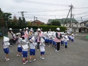 「地震です、地震です。鉄棒近く家から煙がみえます。駐車場に避難してください。」