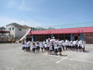 年長組は救助袋から、年中組は非常すべり台から避難しました。